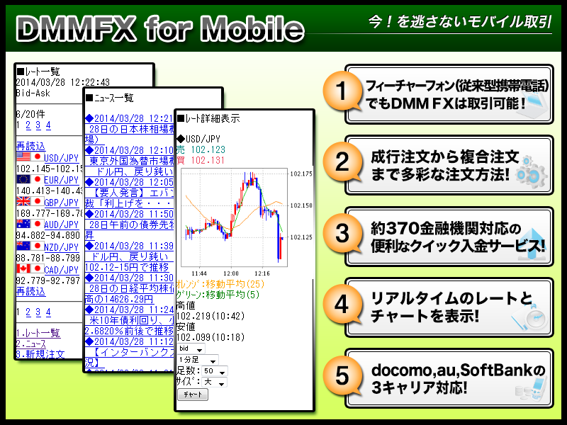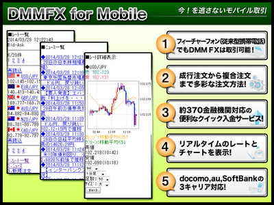 DMMFXでは、多様化するモバイルデバイスに対応し、いつでも、どこでも自由に取引できる環境が整えられています。